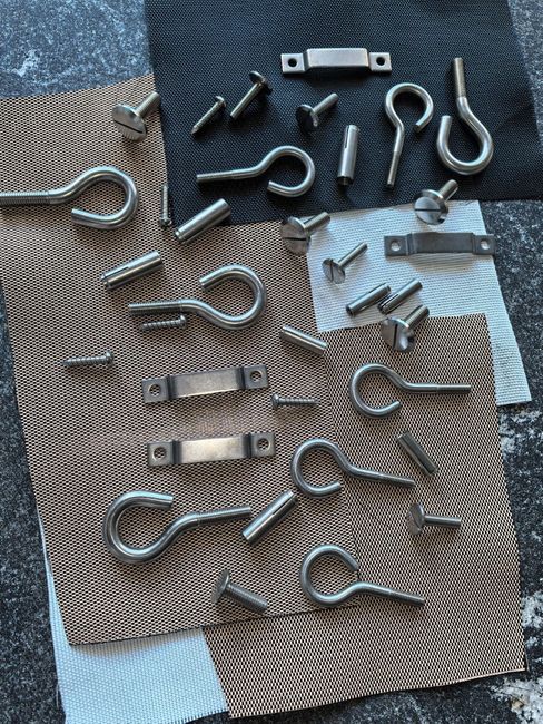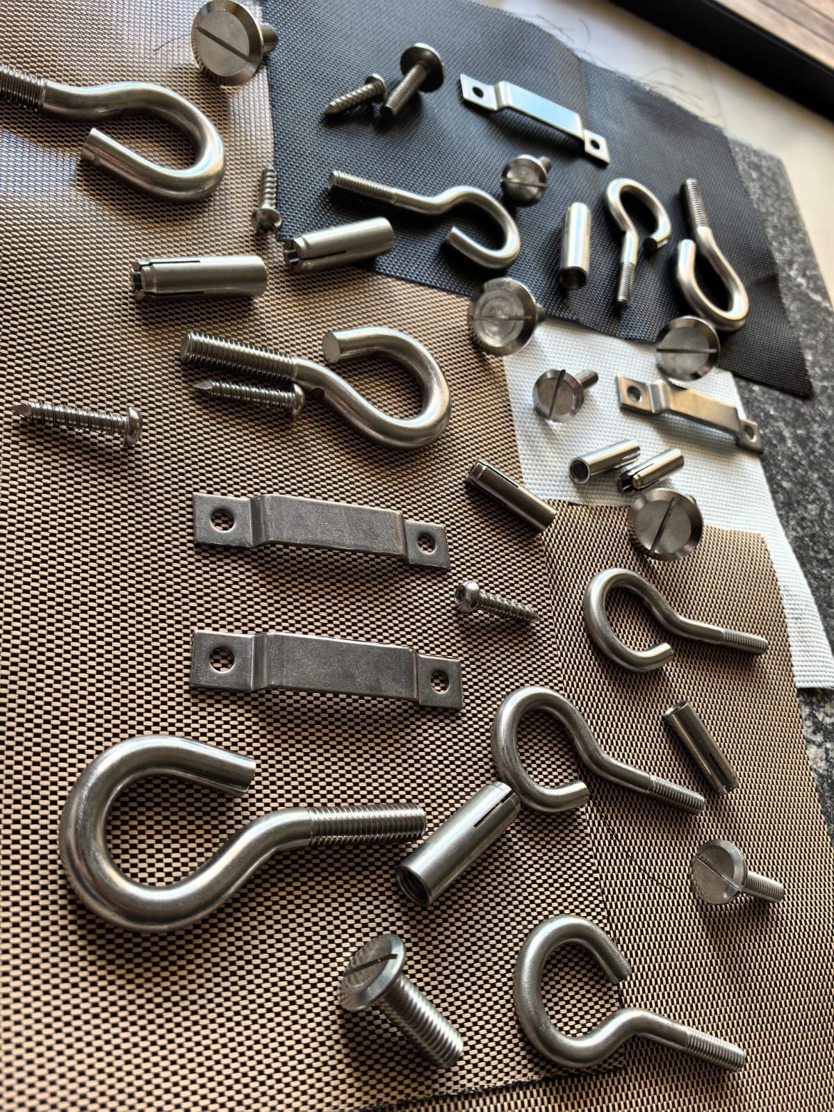 Contamos con armellas, taquetes, tornillos de acero inoxidable 304. Espesores de herrajes 3/8" y 1/2". Tambien contamos con Sujetadores o Floops y tornillos para los mismos. www.aceroinoxidable304.com